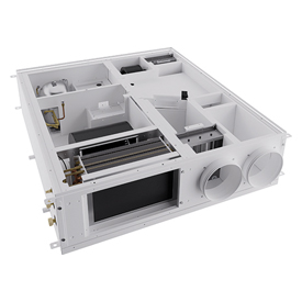 Unità di ventilazione canalizzabile a doppio flusso con recupero di calore ad altissimo rendimento, compressore inverter e serranda integrata più ulteriore sezione di trattamento dell’aria primaria per consentire deumidificazione ed eventuale integrazione in riscaldamento e raffrescamento.