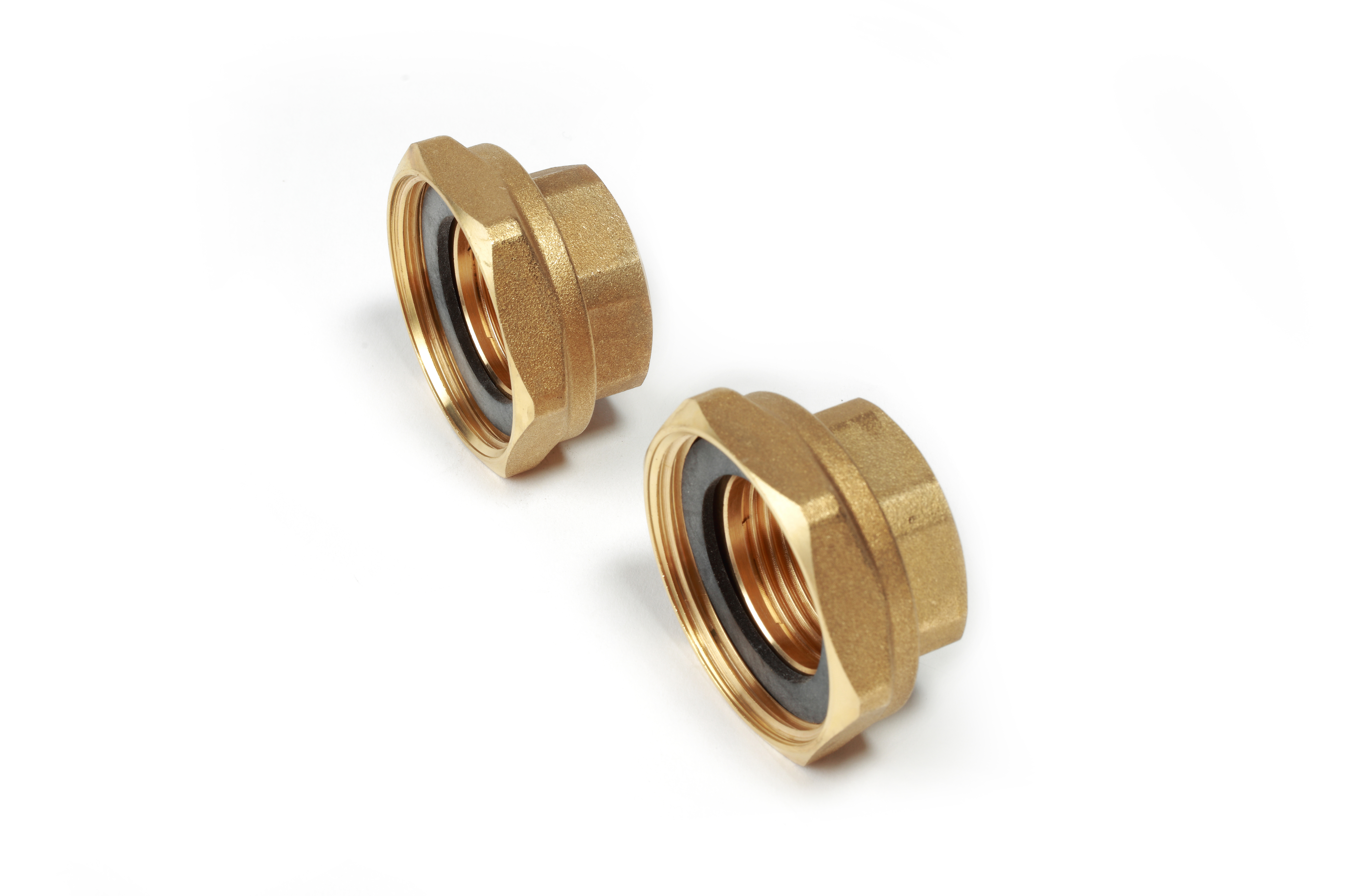 Coppia di bocchettoni in ottone, attacchi femmina-sede piana, completi di calotte e guarnizioni.