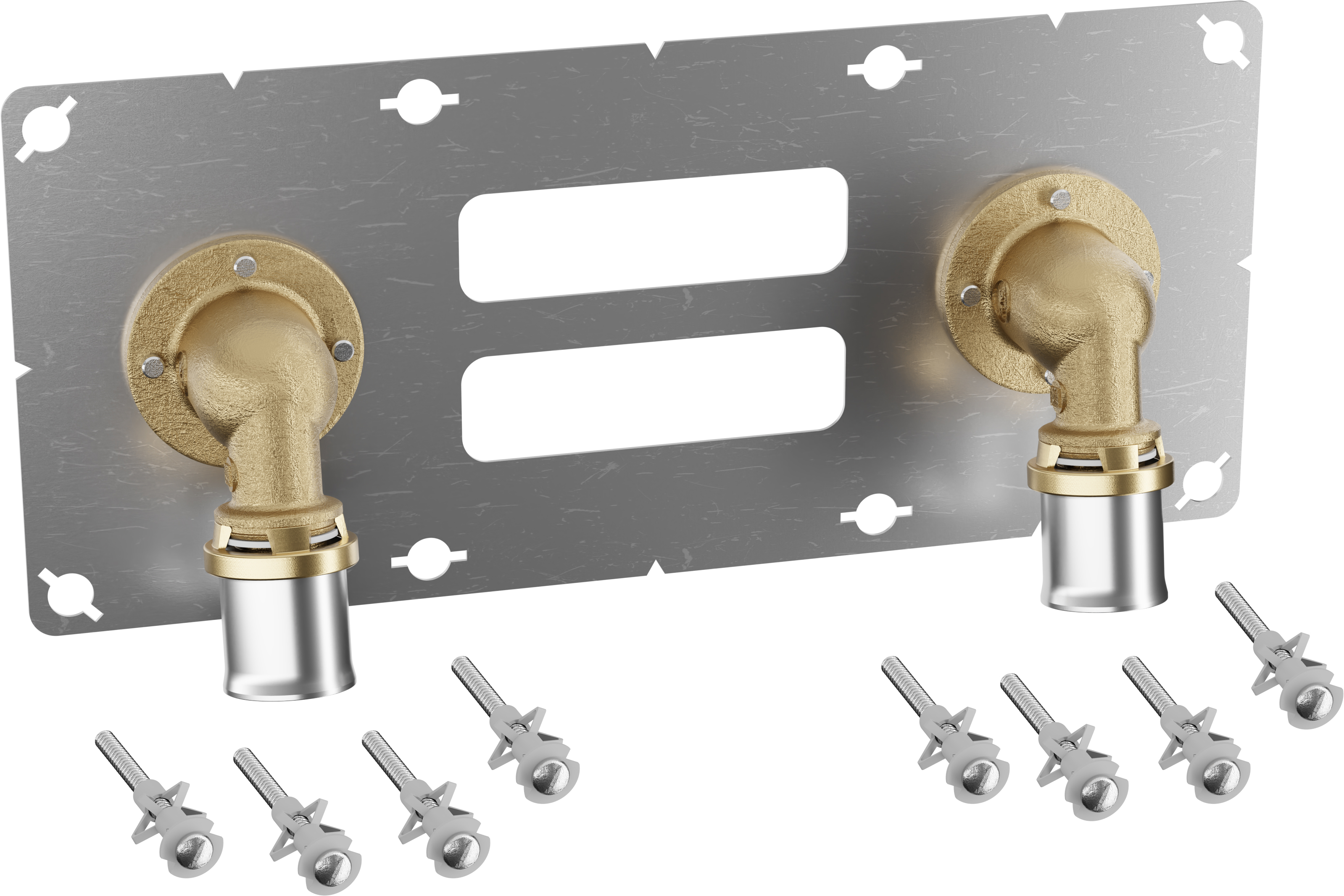 Kit con staffa per parete in cartongesso in acciaio zincato, due raccordi curvi 105° filettati femmina con una connessione a pressare multipinza, viti per fissaggio raccordi su piastra e tasselli per cartongesso.
